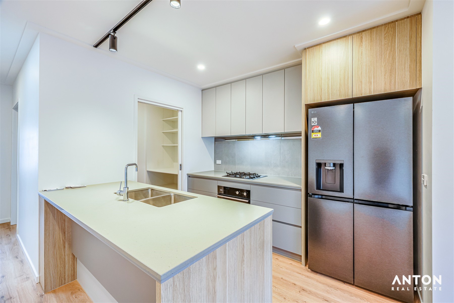 The heart of the home is the light-filled open-plan living and dining area, enhanced by timber flooring and large windows that allow abundant natural light throughout the day. Adjoining this space is a sleek, contemporary kitchen fitted with quality appliances, ample cabinetry, a large island bench for casual meals or entertaining, and a refrigerator included for tenant use, providing added convenience from day one.