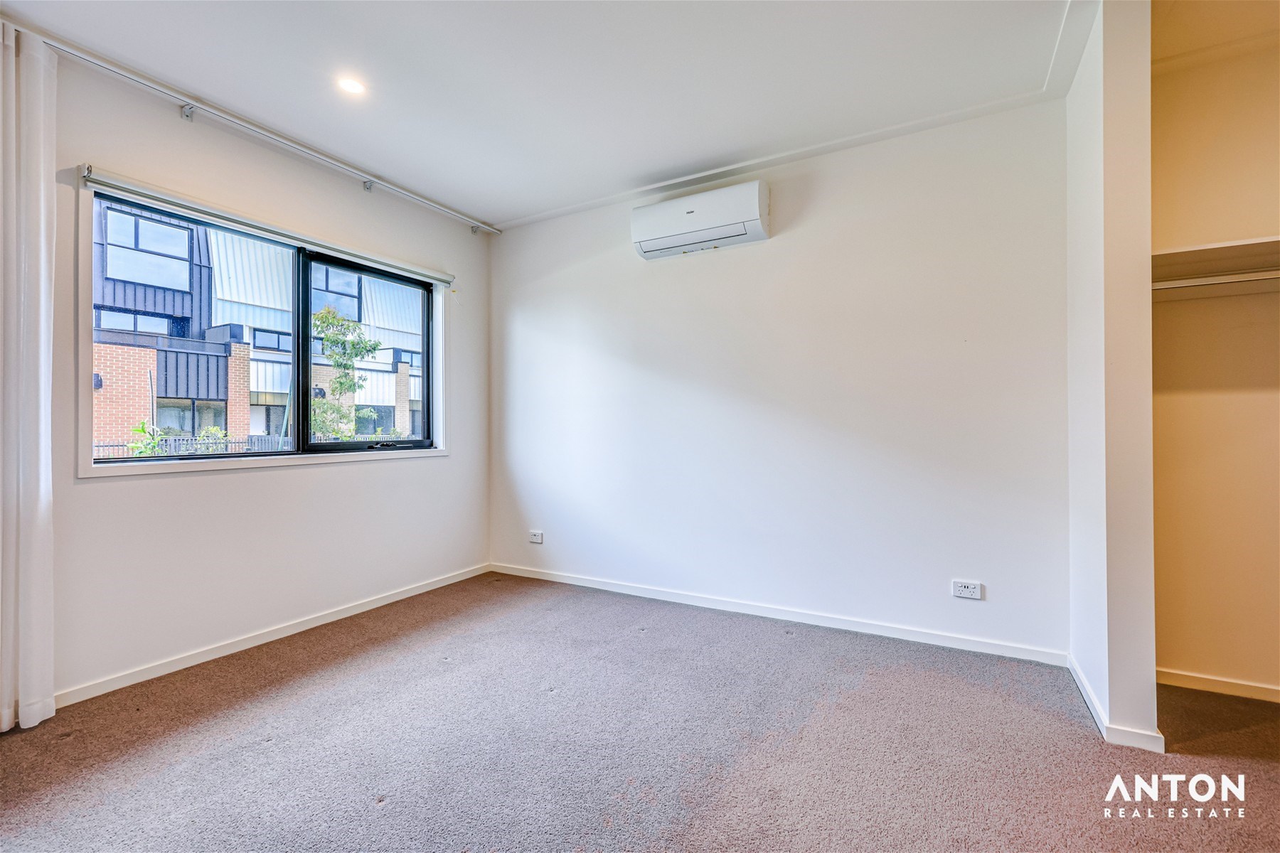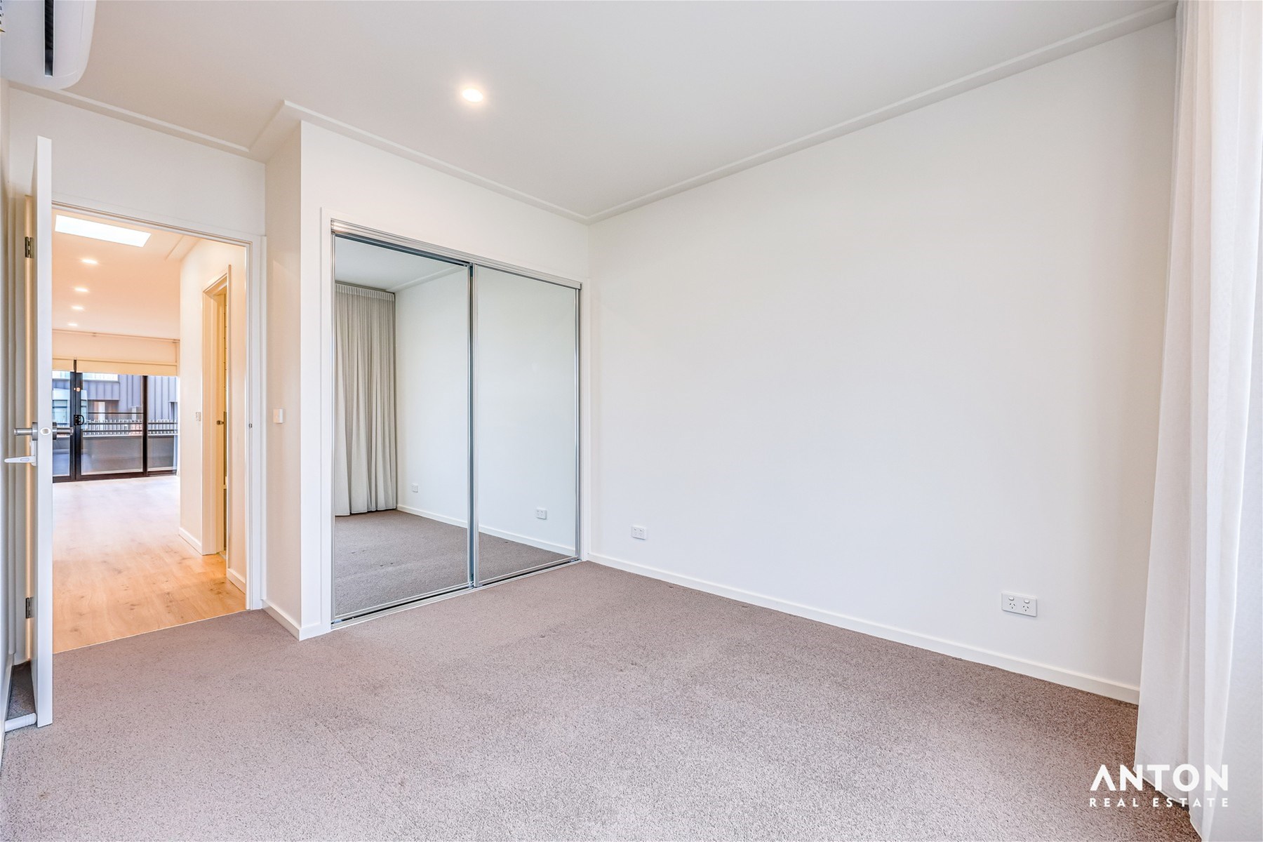 Sliding glass doors connect the living area to a private outdoor space, perfect for relaxing, enjoying a morning coffee, or hosting guests. Climate comfort is ensured year-round with split-system heating and cooling, while modern lighting and neutral tones create a warm and inviting atmosphere.