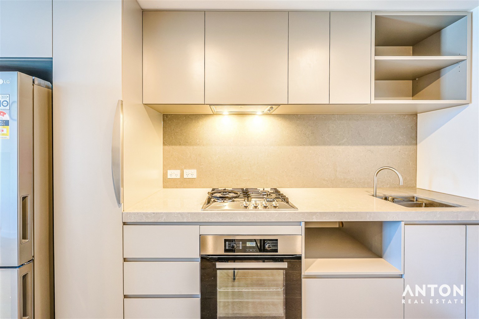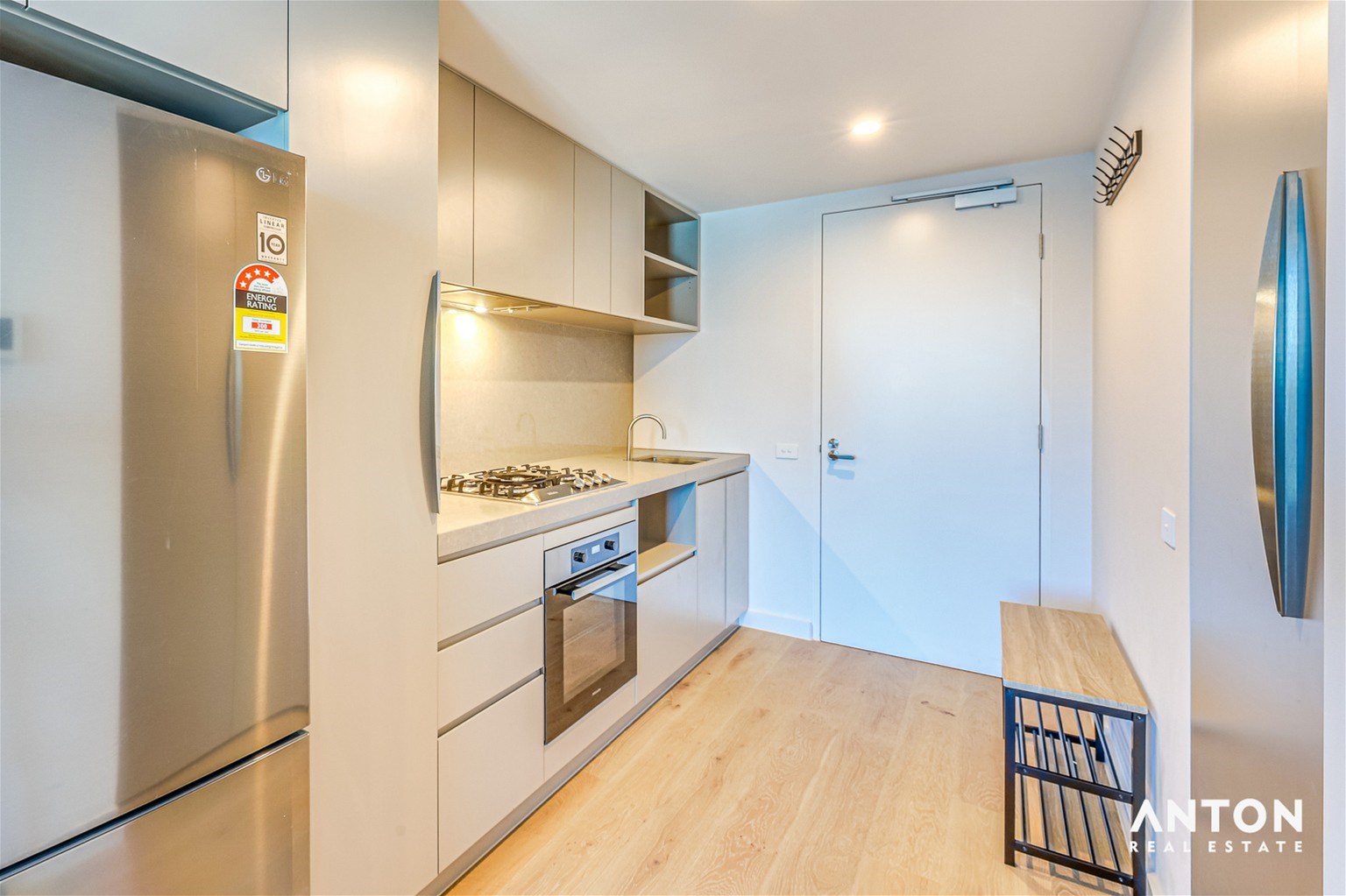 The stylish open-plan layout features a fully equipped kitchen with quality appliances, including gas cooktop, oven, fridge, and dishwasher, seamlessly flowing into a comfortable living and dining area. Both bedrooms are generously sized with built-in wardrobes, and the two sleek bathrooms provide modern comfort and privacy.