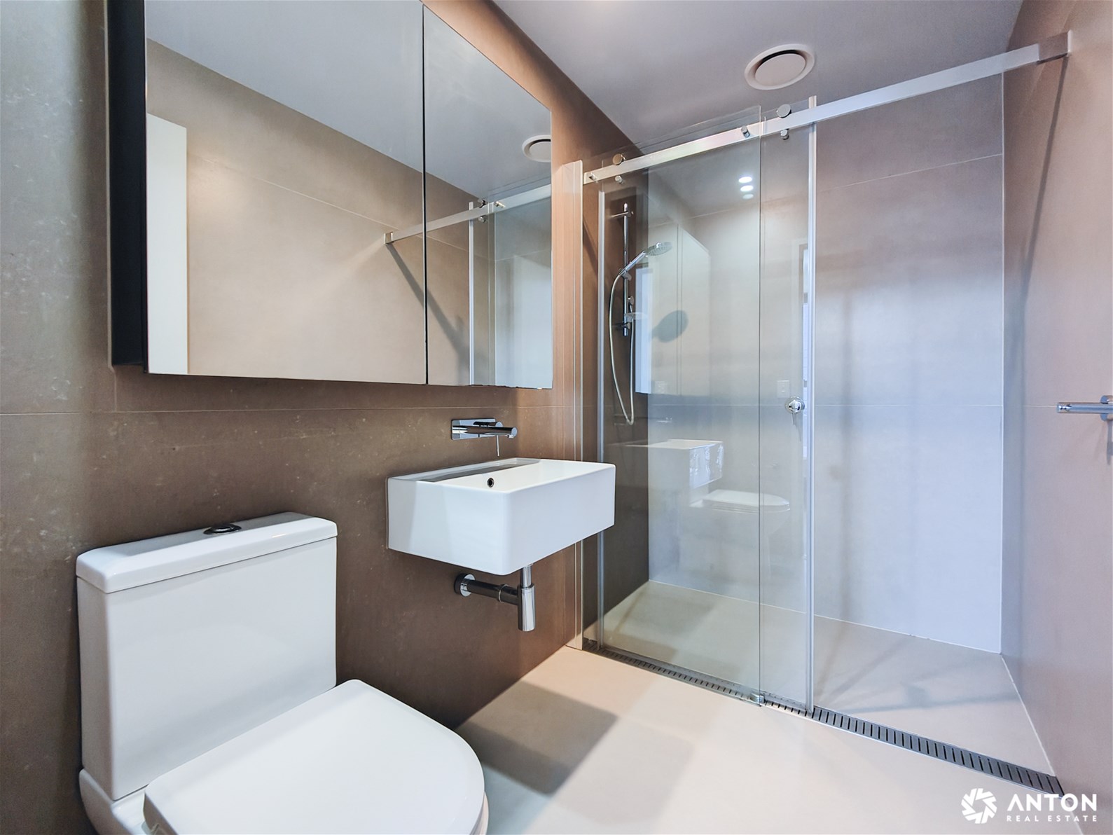 - Sparkling central bathroom with walk-in shower and functional storage.