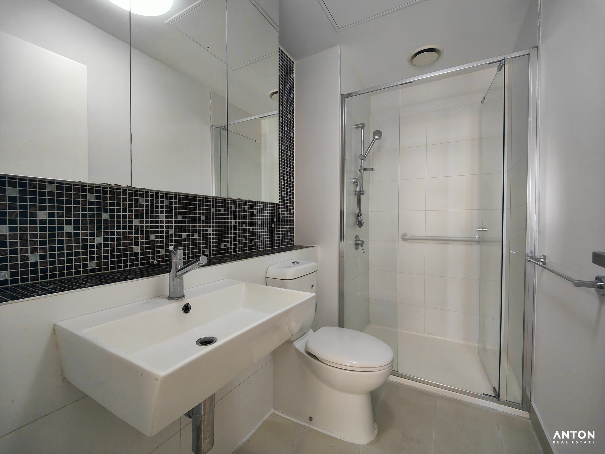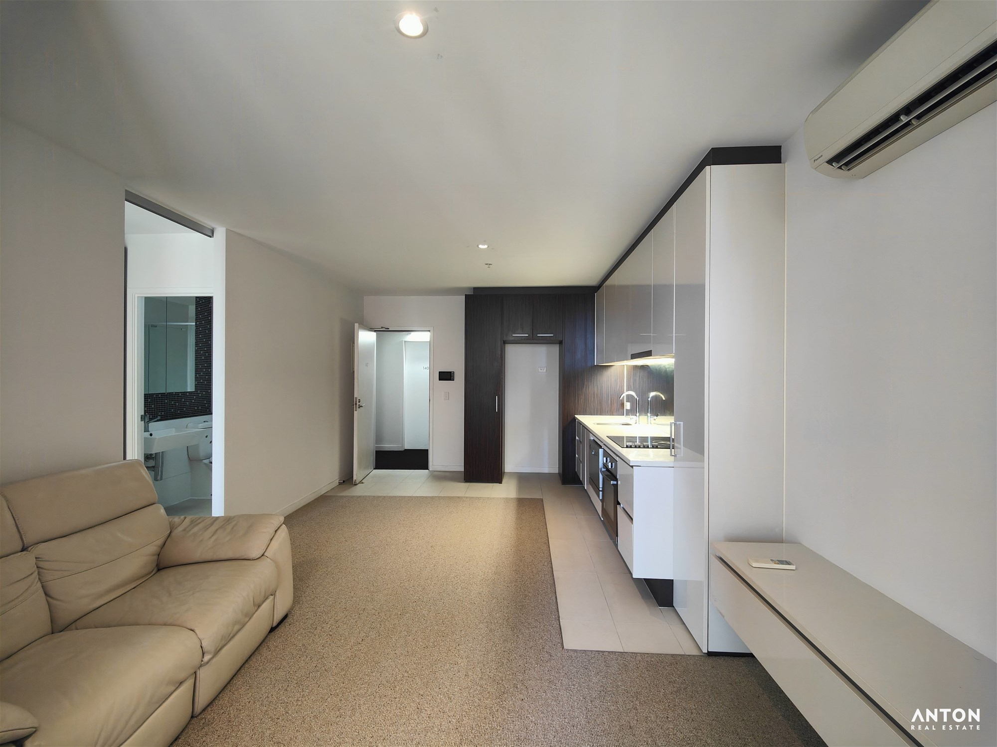 A sleek, modern bathroom and a private balcony complete the apartment, offering a perfect place to unwind and enjoy the city outlook.