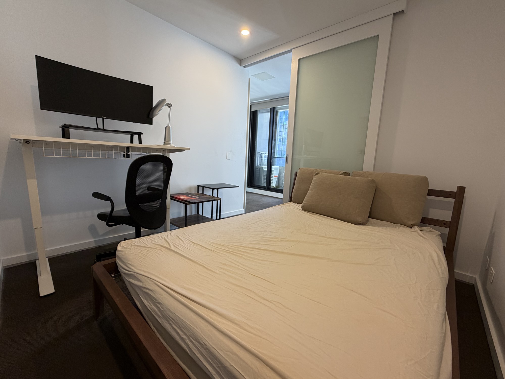 The spacious bedroom includes built-in wardrobes and is thoughtfully furnished for comfort and functionality. A sleek central bathroom is finished with contemporary fittings, while the apartment’s clever layout maximises space and liveability.