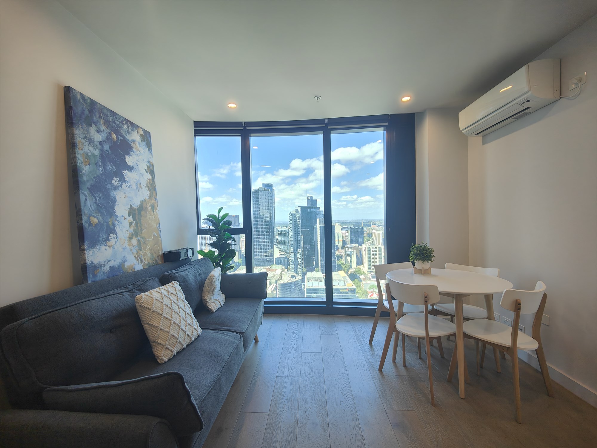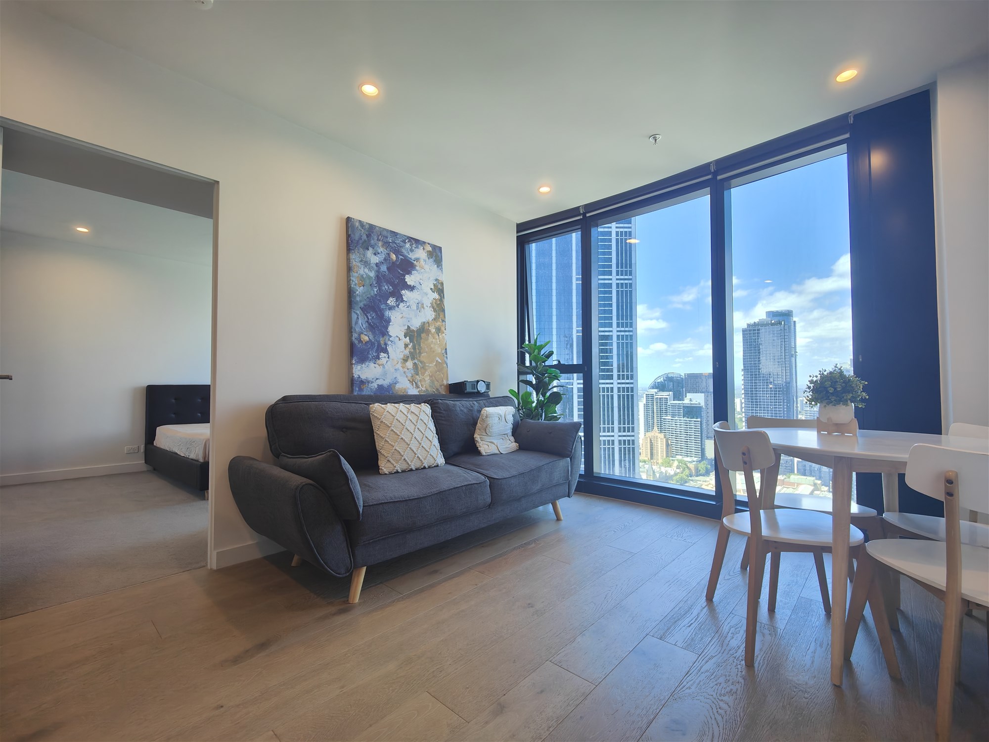 This fully furnished two-bedroom apartment positioned high above the city, offering comfort, light, and unbeatable inner-city convenience.
