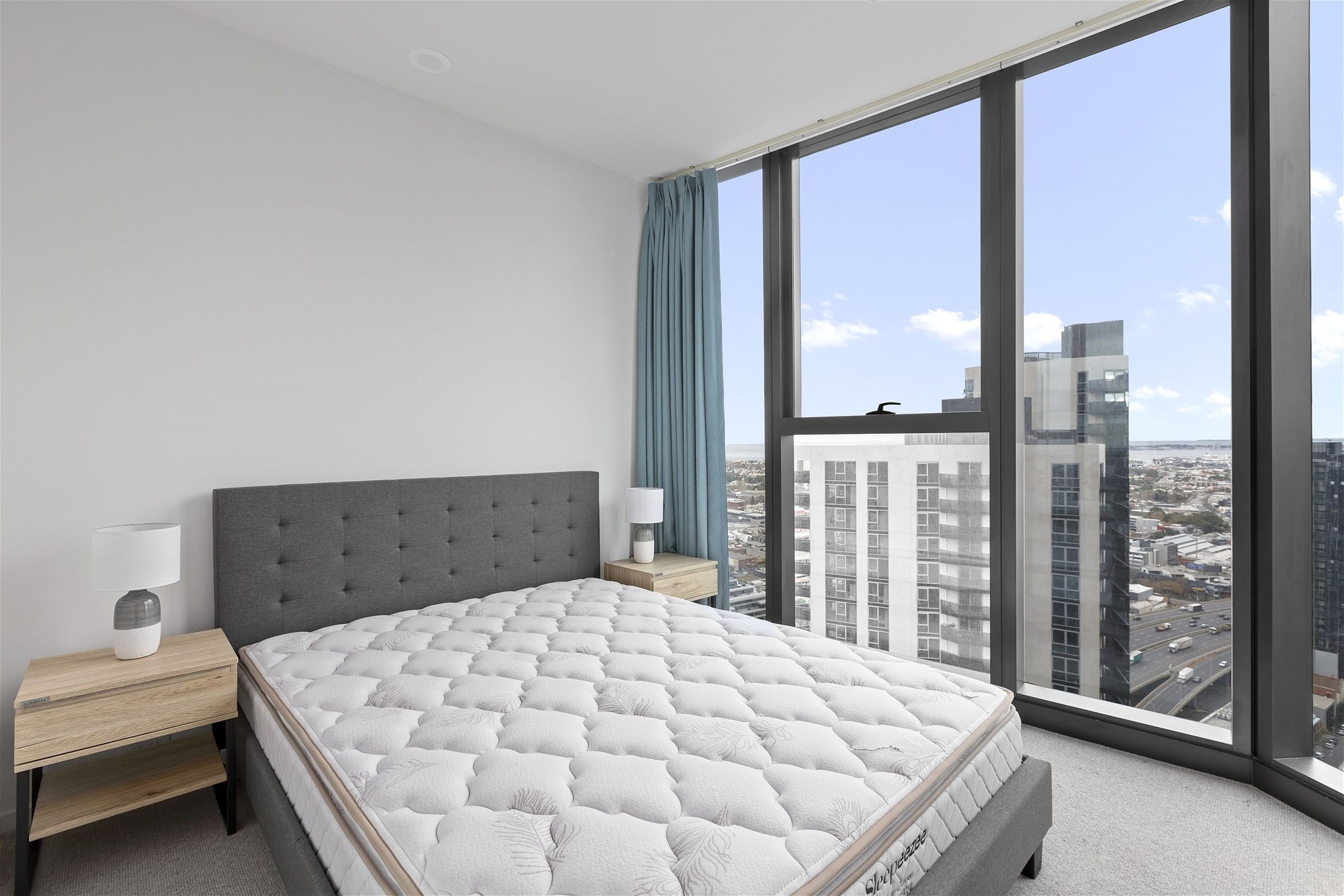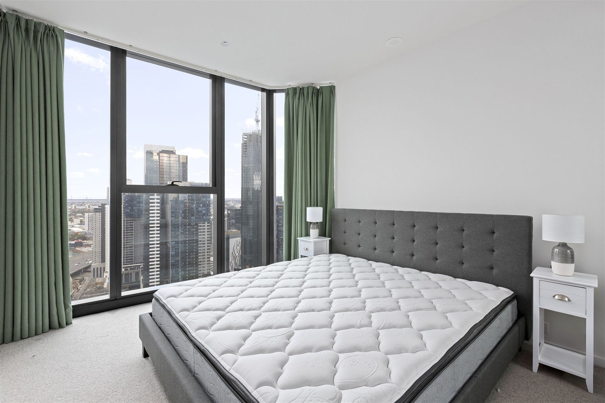 • Master bedroom with floor-to-ceiling windows showcasing expansive skyline views
