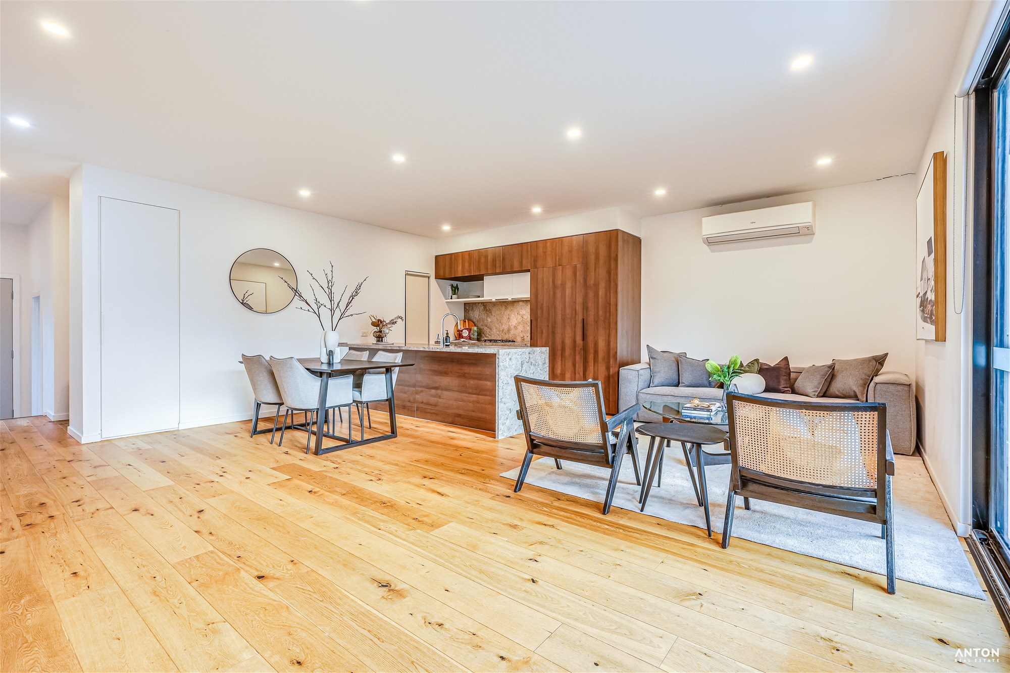 Open-plan living and dining area filled with natural light